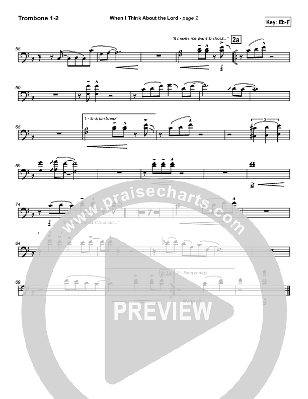 Download the Trombone 1,2 sheet music for When I Think About The Lord by Jason Breland, from the album Believe. This song was arranged by Daniel Galbraith in the key of D, Eb.
