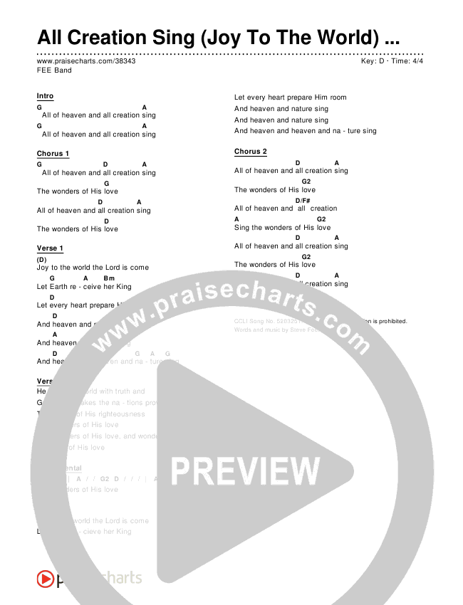 Download the PDF Chord Charts for All Creation Sing (Joy To The World) (Simplified) by FEE Band, from the album Simplified Worship. This song was arranged by PraiseCharts in the key of A,Ab,B,Bb,C,D,Db,E,Eb,F,G,Gb.