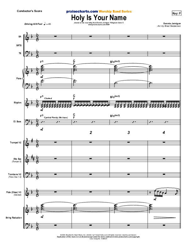 Download the Orchestration for Holy Is Your Name by Dennis Jernigan, from the album Kingdom Come. This song was arranged by Brad Henderson in the key of F, G.