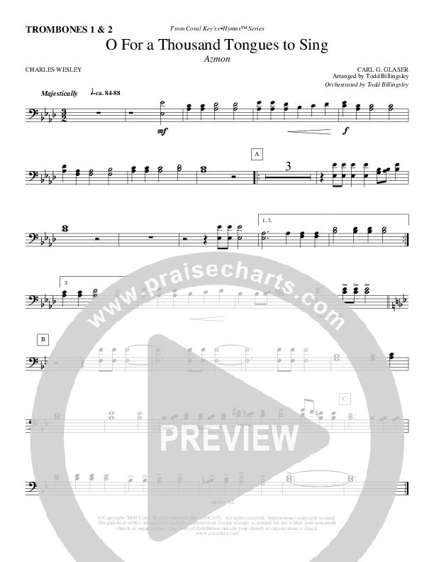 Download the Trombone 1,2 sheet music for O For A Thousand Tongues To Sing by Todd Billingsley, from the album Congregational Hymn Anthems.