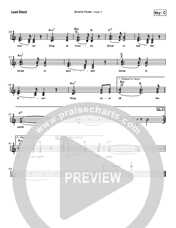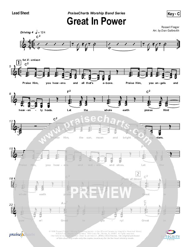 Download the sheet music for Great In Power by Hillsong Worship, from the album By Your Side. This song was arranged by Daniel Galbraith in the key of C, D.