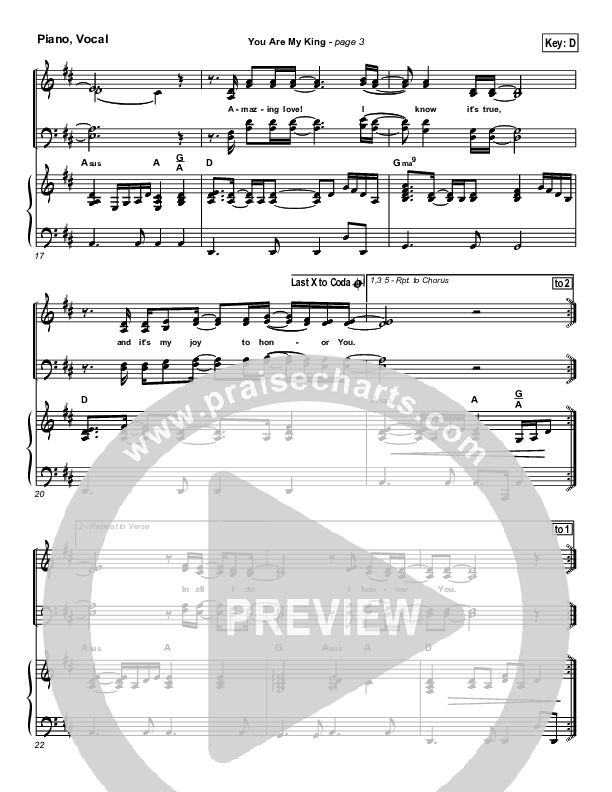 Download the sheet music for You Are My King (Amazing Love) by Christy Nockels, from the album Passion: Better Is One Day. This song was arranged by Daniel Galbraith in the key of D, Eb.