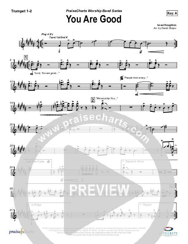 Download the Orchestration brass parts for You Are Good by Travis Cottrell, from the album Unashamed Love. This song was arranged by David Shipps in the key of A, Bb.