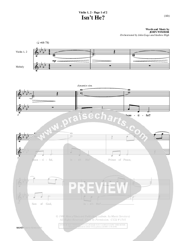 Download the Violin sheet music for Isn't He by John Wimber, from the album Word Music Now. This song was arranged by John Gage / Andrew High in the key of Ab, G.