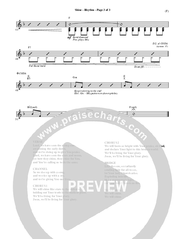 Download the Rhythm Chart for Shine by Matt Redman, from the album Word Music Now. This song was arranged by David Shipps in the key of F, G.