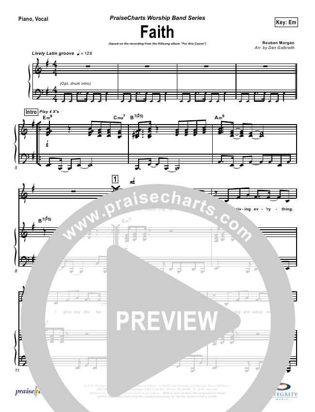 Download the sheet music for Faith by Hillsong Worship, from the album For This Cause. This song was arranged by Daniel Galbraith in the key of Em, Fm.