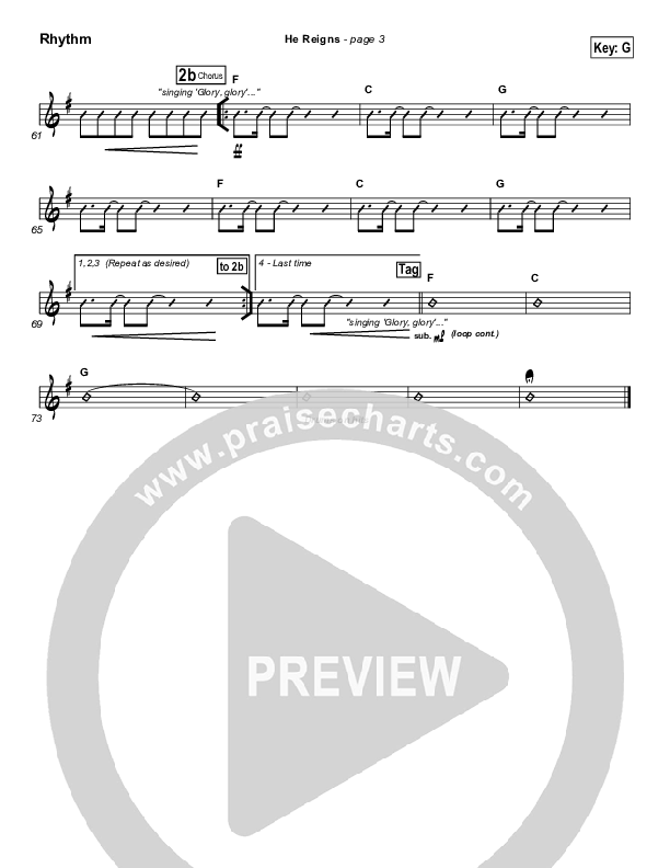 Download the Rhythm Chart for He Reigns by Newsboys, from the album Adoration. This song was arranged by Daniel Galbraith in the key of F, G.