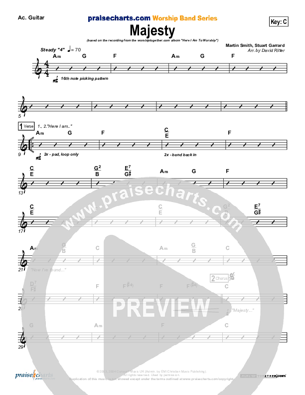 Worship songs about majesty celebrate God's greatness, glory, and supreme authority over all creation. These songs inspire awe and reverence for God's powerful, royal presence. Download chord charts, lead sheets, orchestrations, and multitracks to bring these majestic songs to life, uplifting worshipers in praise of God's splendor.