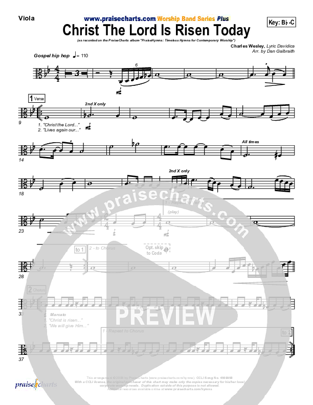 Download the Viola sheet music for Christ The Lord Is Risen Today by PraiseCharts Band / Arr. Daniel Galbraith, from the album PraiseHymns (Vol. 1). This song was arranged by Daniel Galbraith in the key of Bb, C.