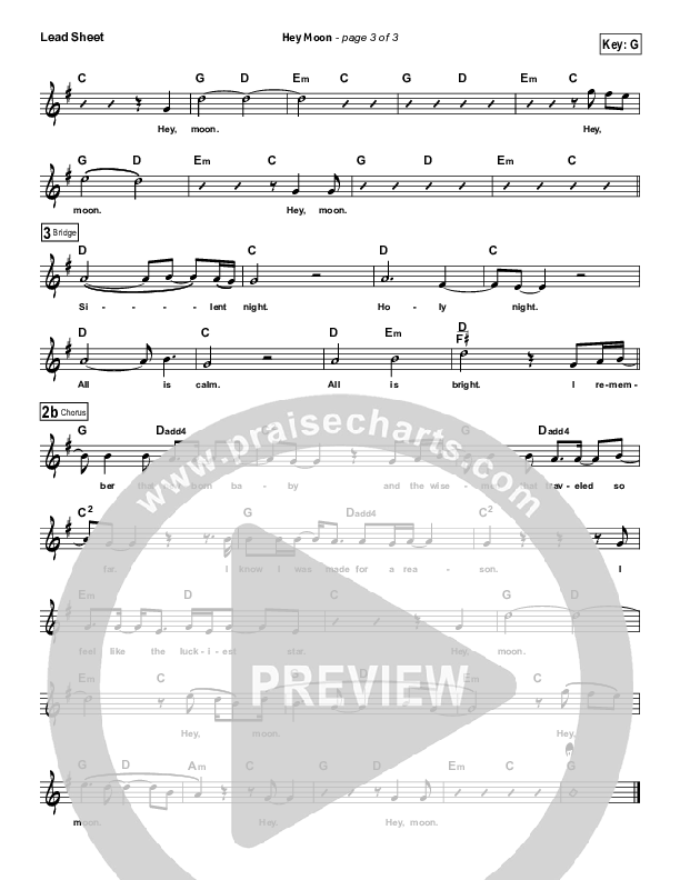 Download the sheet music for Hey Moon by Sidewalk Prophets, from the album Merry Christmas To You. This song was arranged by Dave Iula / Brad Henderson in the key of F, G.