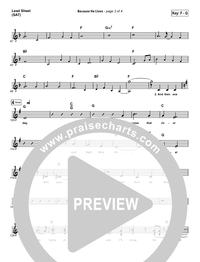 Download the sheet music for Because He Lives by David Crowder, from the album Neon Steeple. This song was arranged by Daniel Galbraith in the key of F, G.
