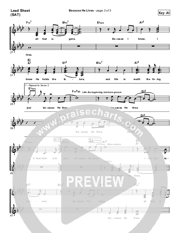 Download the sheet music for Because He Lives by PraiseCharts Band / Arr. Daniel Galbraith, from the album PraiseHymns (Vol. 2). This song was arranged by Daniel Galbraith in the key of Ab, G.