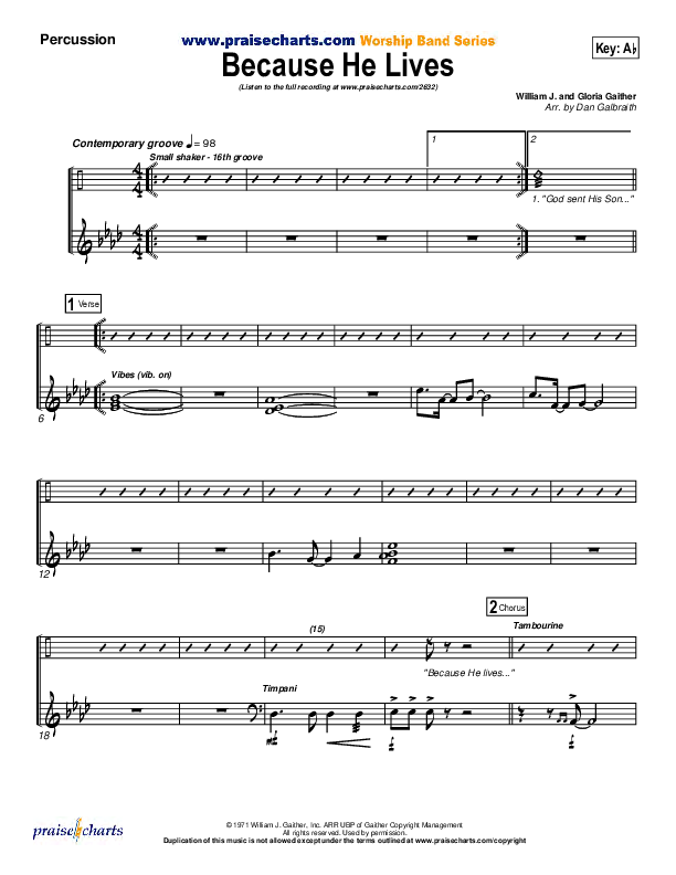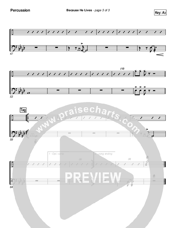 Download the percussion sheet music for Because He Lives by PraiseCharts Band / Arr. Daniel Galbraith, from the album PraiseHymns (Vol. 2). This song was arranged by Daniel Galbraith in the key of Ab, G.