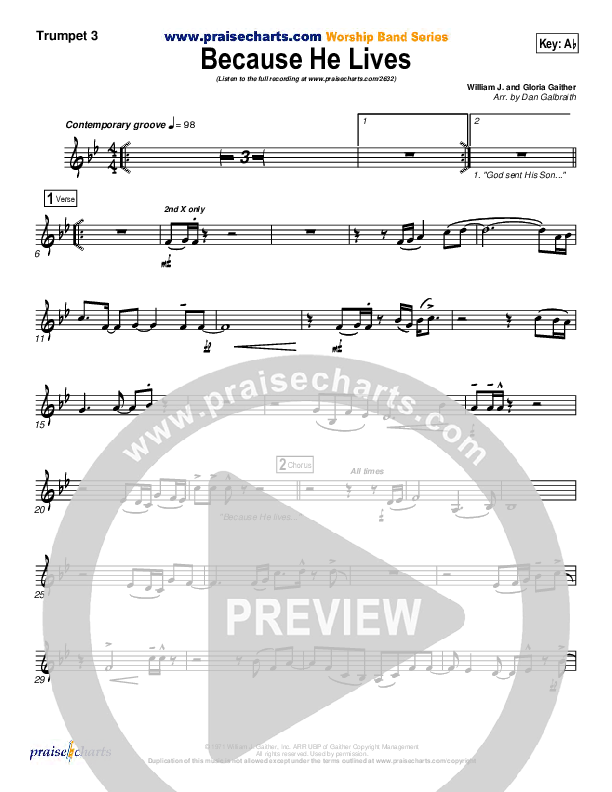 Because He Lives Trumpet Sheet Music PDF (PraiseCharts Band / Arr. Daniel Galbraith)