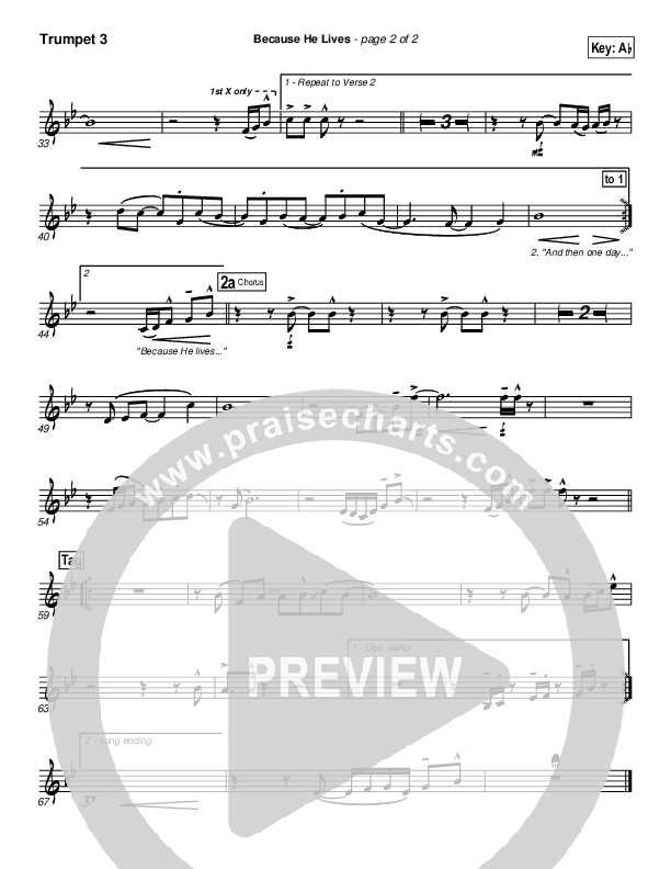 Download the Trumpet 3 sheet music for Because He Lives by PraiseCharts Band / Arr. Daniel Galbraith, from the album PraiseHymns (Vol. 2). This song was arranged by Daniel Galbraith in the key of Ab, G.