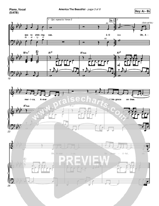 Download the sheet music for America The Beautiful by PraiseCharts Band / Arr. Daniel Galbraith, from the album Patriotic PraiseHymns. This song was arranged by Daniel Galbraith in the key of Ab, G.