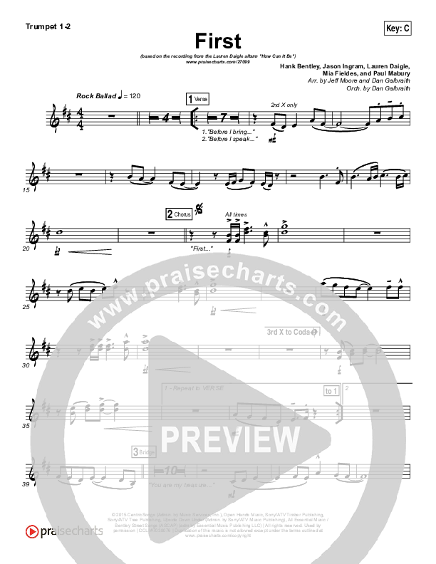 Download the Orchestration brass parts for First by Lauren Daigle, from the album How Can It Be. This song was arranged by Jeff Moore / Daniel Galbraith in the key of A, C, D.