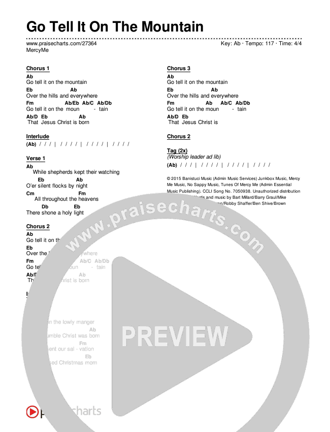 Download the PDF Chord Charts for Go Tell It On The Mountain by MercyMe, from the album It's Christmas. This song was arranged by Dustin Loehrs / Daniel Galbraith in the key of Ab, G.