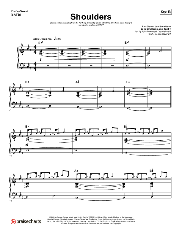 Download the sheet music for Shoulders by for KING & COUNTRY, from the album Run Wild Live Free. This song was arranged by Erik Foster / Daniel Galbraith in the key of D, Eb.