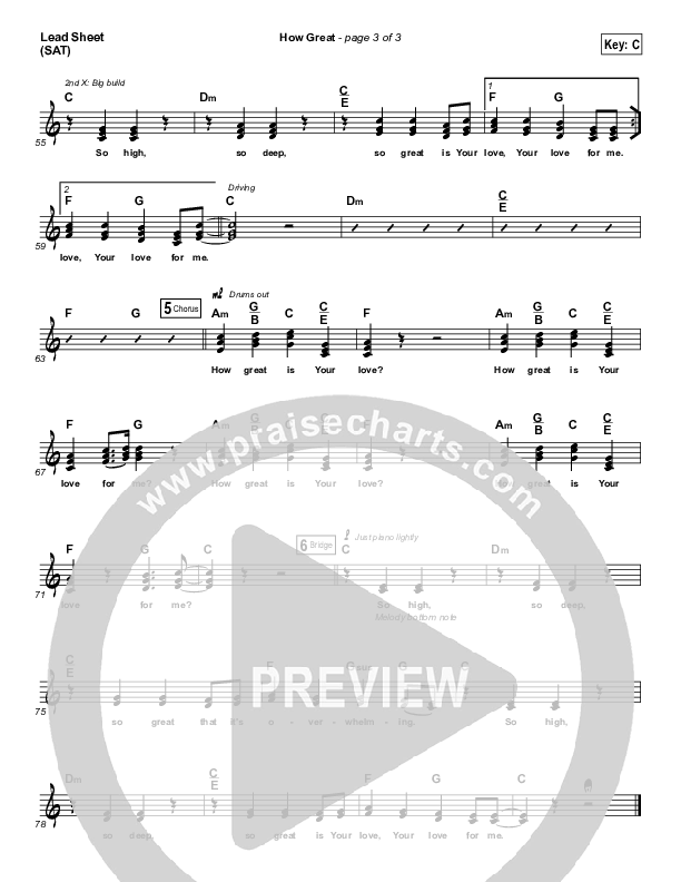 Download the sheet music for How Great by Corey Voss, from the album How Great. This song was arranged by Dustin Loehrs in the key of Bb, C.