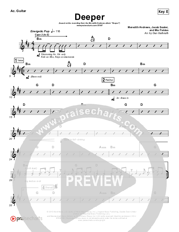Download the Rhythm Chart for Deeper by Meredith Andrews, from the album Deeper. This song was arranged by Daniel Galbraith in the key of E, F.