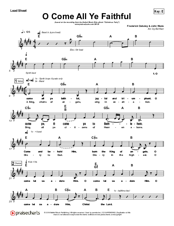 Download the sheet music for O Come All Ye Faithful by Bethel Kids, from the album Christmas Party. This song was arranged by Ed Kerr in the key of E, F.
