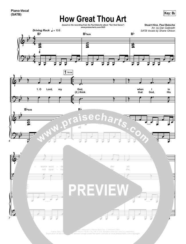 Download the sheet music for How Great Thou Art by Paul Baloche, from the album Our God Saves. This song was arranged by Daniel Galbraith in the key of A, Ab, Bb, C, G.