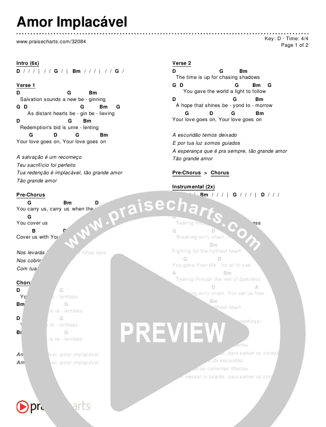 Download the PDF Chord Charts for Amor Implacável, from the album Worship Songs In Portuguese.