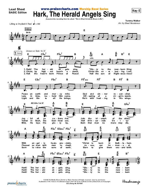 Download the sheet music for Hark The Herald Angels Sing by Tommy Walker, from the album This Is What Christmas Means To Me. This song was arranged by Brad Henderson in the key of E, F.