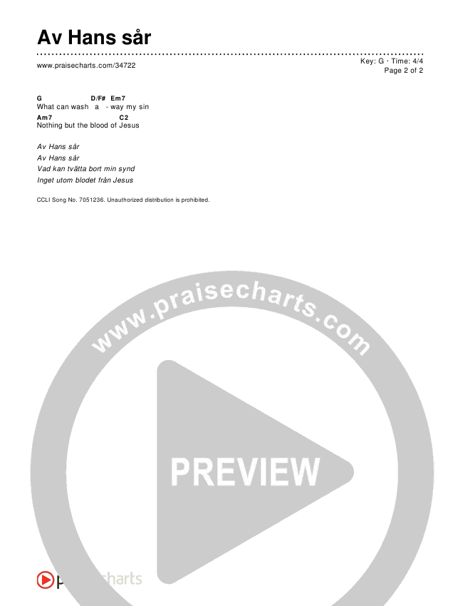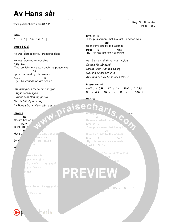 Download the PDF Chord Charts for Av Hans sår, from the album Worship Songs In Swedish.