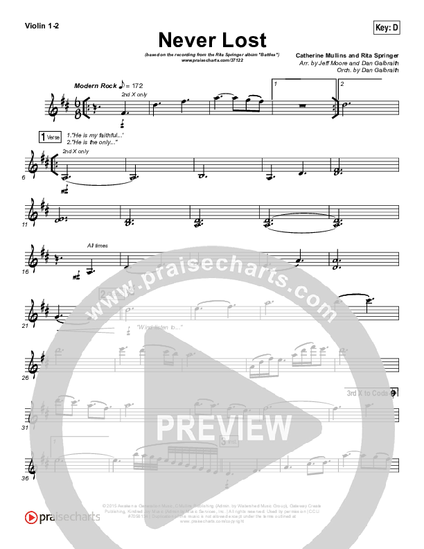 Download the Violin sheet music for Never Lost by Rita Springer, from the album Battles. This song was arranged by Jeff Moore / Daniel Galbraith in the key of D, Eb.