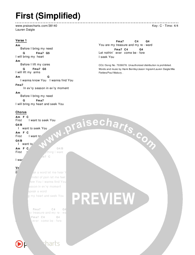 Download the PDF Chord Charts for First (Simplified), from the album Simplified Worship. This song was arranged by PraiseCharts in the key of A, Ab, B, Bb, C, D, Db, E, Eb, F.