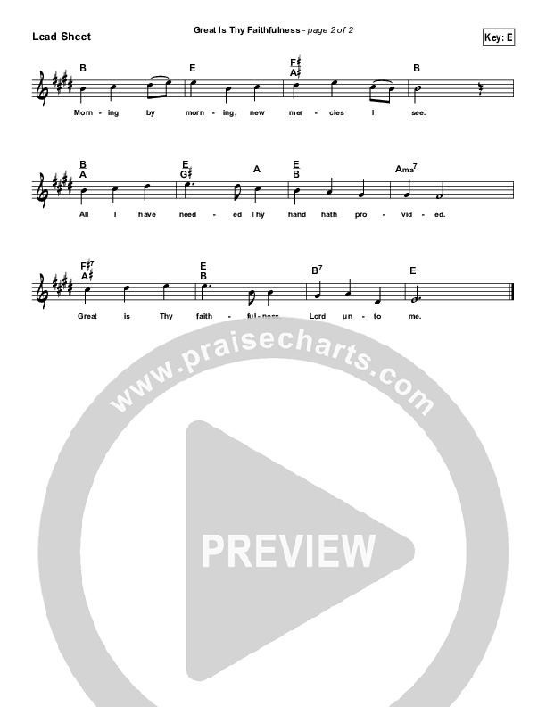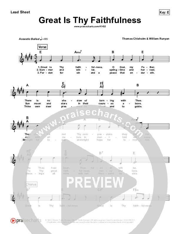 Verse 1 Great is Thy faithfulness, O God, my Father There is no shadow of turning with Thee Thou changest not Thy compassions they fail not As Thou hast been Thou forever will be Chorus Great is Thy faithfulness, great is Thy faithfulness Morning by morning, new mercies I see All I have needed Thy hand hath provided Great is Thy faithfulness, Lord unto me Verse 2 Summer and winter, springtime and harvest Sun moon and stars in their courses above Join with all nature in manifold witness To Thy great faithfulness, mercy and love Verse 3 Pardon for sin and a peace that endureth Thine own dear presence to cheer and to guide Strength for today and bright hope for tomorrow Blessings all mine with ten thousand beside...