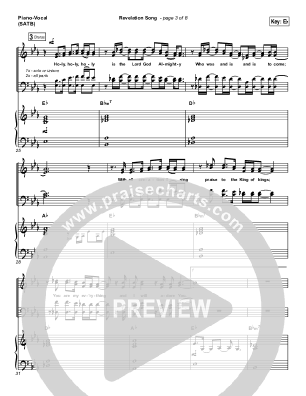 Download the sheet music for Revelation Song by Kari Jobe, from the album Kari Jobe. This song was arranged by Joel Mott / Daniel Galbraith in the key of D, E, Eb.