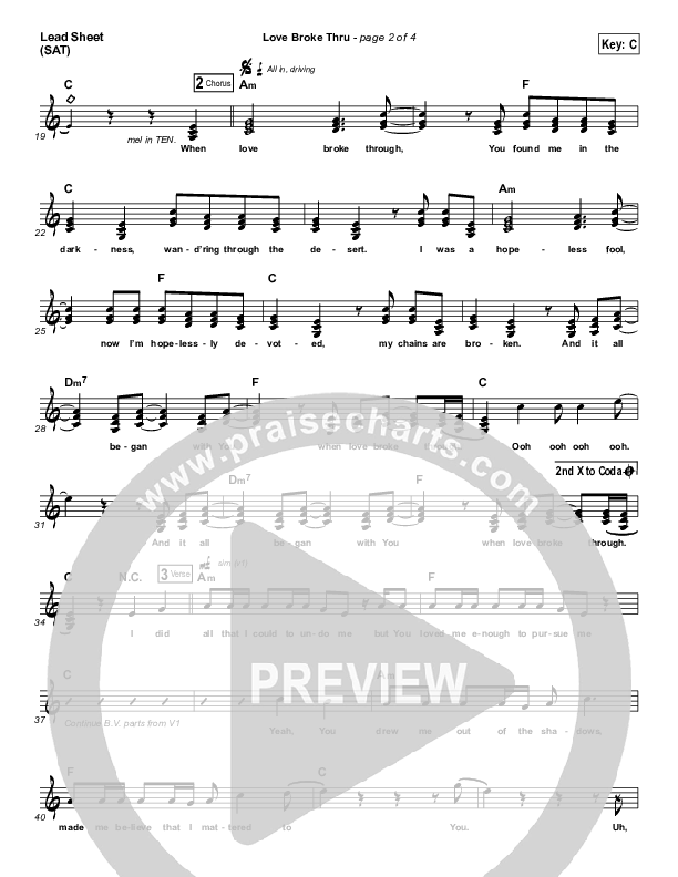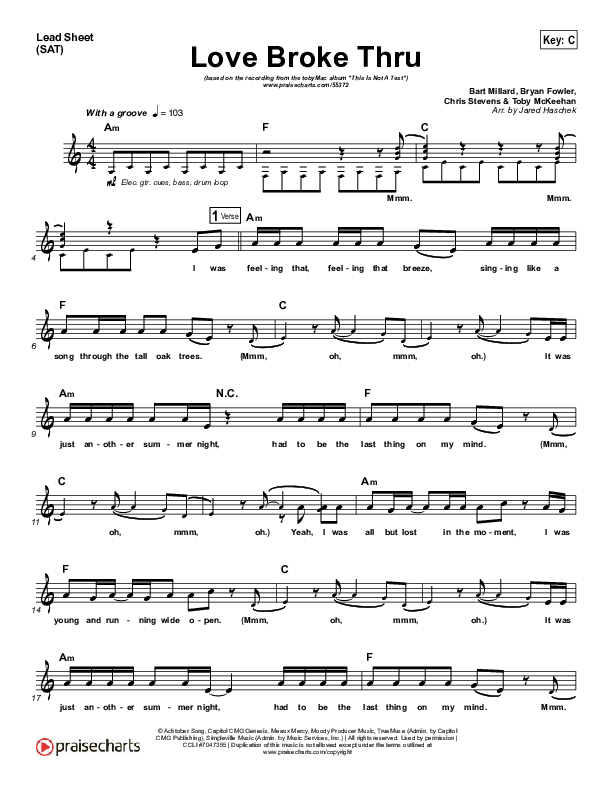 Download the sheet music for Love Broke Thru by TobyMac, from the album This Is Not A Test. This song was arranged by Jared Haschek in the key of B, C.