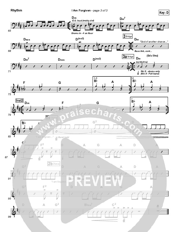 Download the Rhythm Chart for I Am Forgiven by Free Chapel, from the album Power Of The Cross. This song was arranged by Daniel Galbraith in the key of C, D.