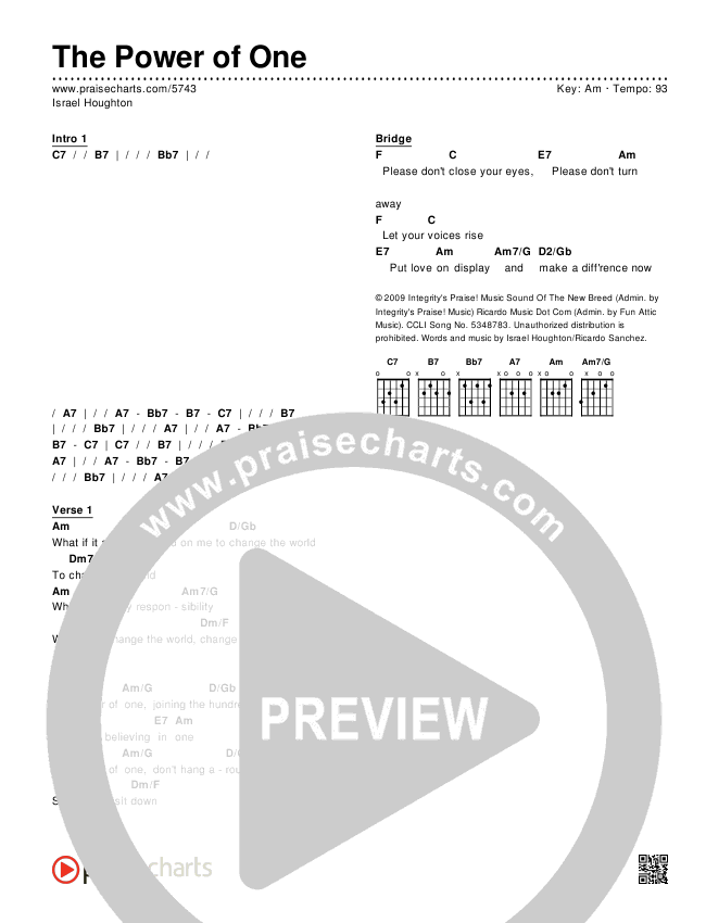 Download the PDF Chord Charts for The Power of One by Israel Houghton, from the album The Power of One. This song was arranged by Joel Mott in the key of Am, Gm.