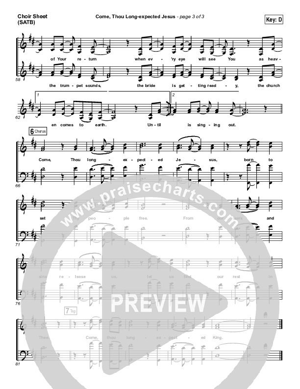 Download the Choir Sheet for Come Thou Long Expected Jesus by Meredith Andrews, from the album Receive Our King. This song was arranged by Daniel Galbraith in the key of C, D.