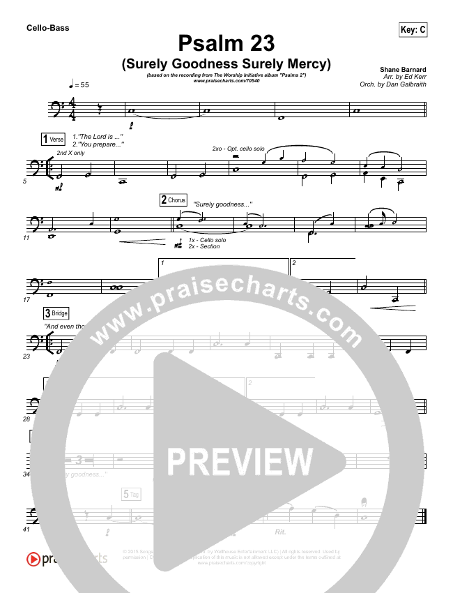 Download the Orchestration string parts for Psalm 23 (Surely Goodness) by Shane & Shane / The Worship Initiative, from the album Psalms 2. This song was arranged by Ed Kerr / Daniel Galbraith in the key of Bb, C.