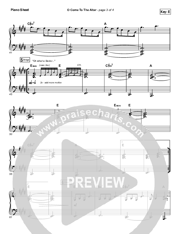Download the piano sheet for O Come To The Altar (Acoustic) by Elevation Worship, from the album Acoustic Sessions. This song was arranged by Dustin Loehrs / Daniel Galbraith in the key of E, F.