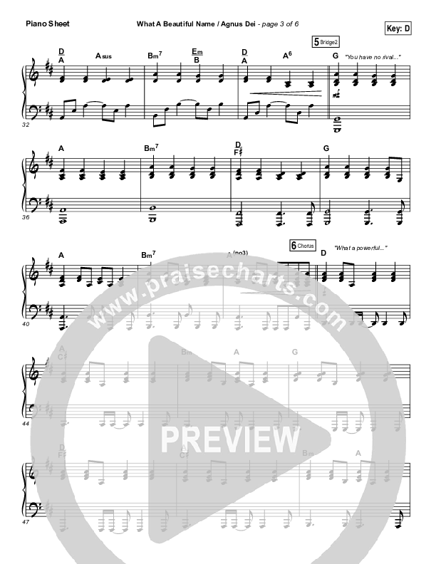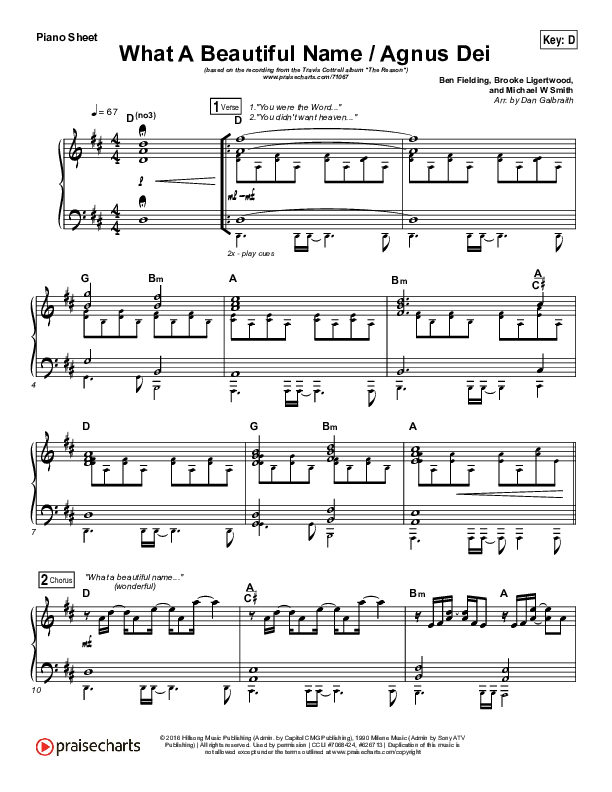 Download the piano sheet for What A Beautiful Name / Agnus Dei (Medley) by Travis Cottrell, from the album The Reason. This song was arranged by Daniel Galbraith in the key of Bb, C, D, E, Eb, F, G.