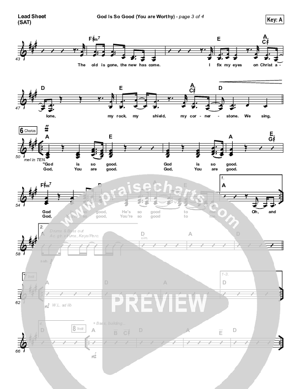 Download the sheet music for God Is So Good (You Are Worthy) by Pat Barrett, from the album Pat Barrett. This song was arranged by Grant Wall in the key of A, G.