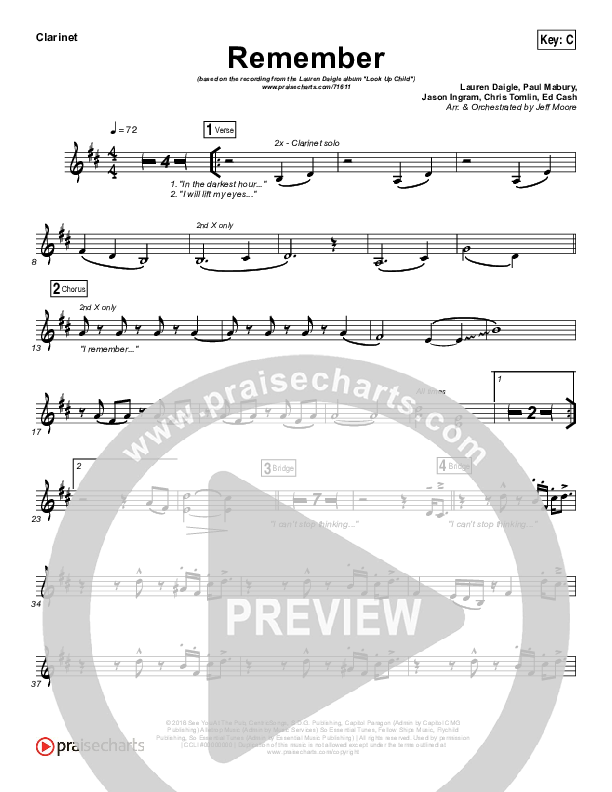Download the Orchestration wind parts for Remember by Lauren Daigle, from the album Look Up Child. This song was arranged by Jeff Moore in the key of C, D.