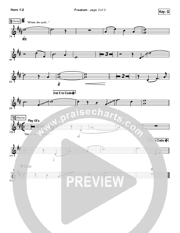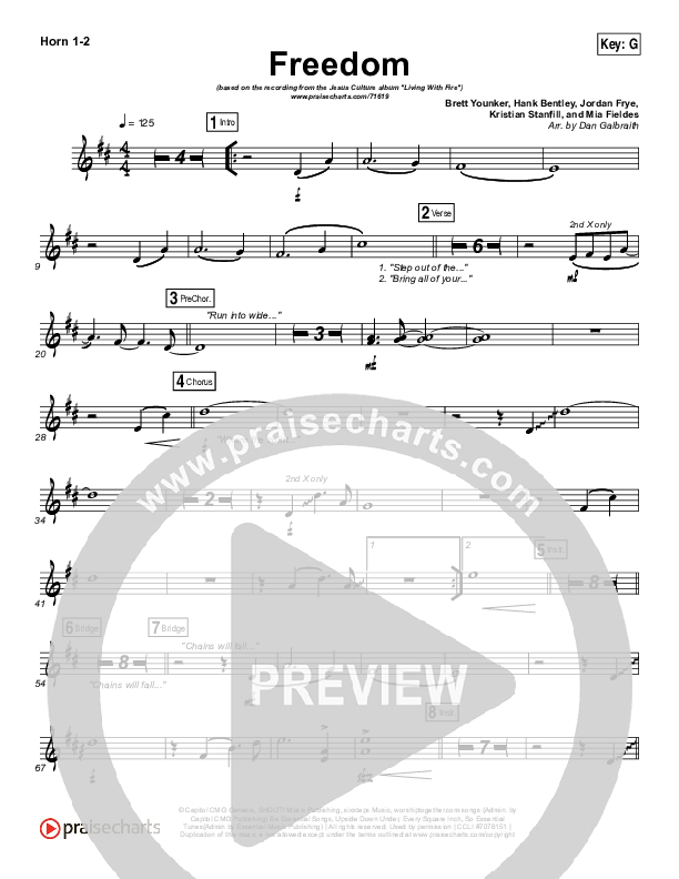 Download the French Horn sheet music for Freedom by Jesus Culture / Kim Walker-Smith, from the album Living With A Fire. This song was arranged by Daniel Galbraith in the key of A, G.