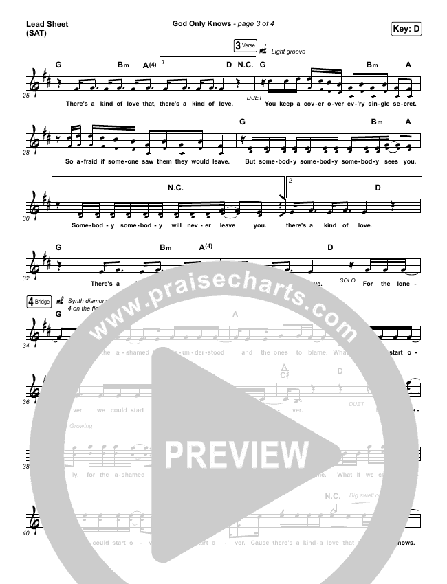 Download the sheet music for God Only Knows by for KING & COUNTRY, from the album Burn The Ships. This song was arranged by Daniel Galbraith in the key of D, Eb.