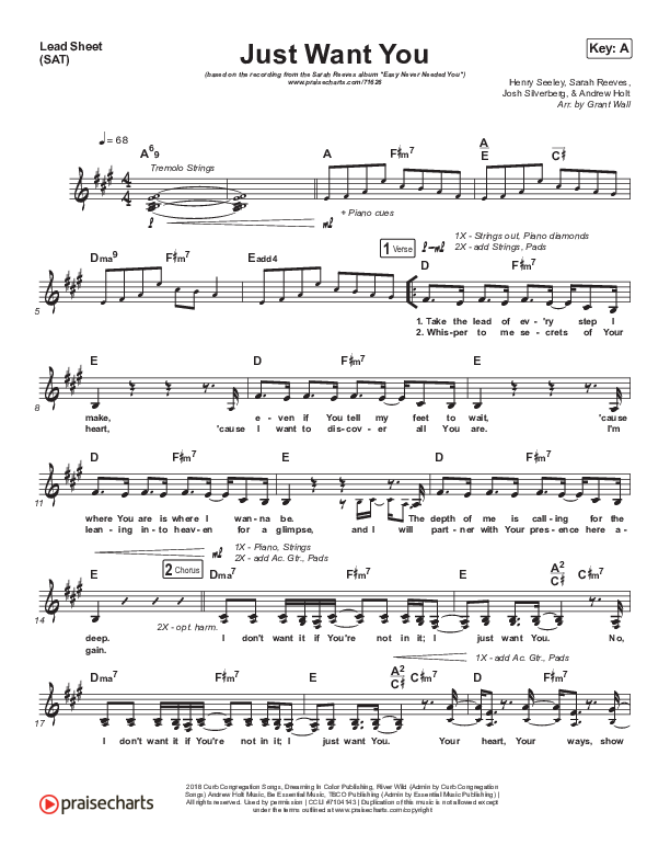 Download the sheet music for Just Want You by Sarah Reeves, from the album Easy Never Needed You. This song was arranged by Grant Wall in the key of A, C.
