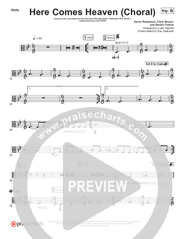 Download the Viola sheet music for Here Comes Heaven (Choral Anthem SATB) by Elevation Worship / Arr. Luke Gambill, from the album Hallelujah Here Below. This song was arranged by Luke Gambill / Daniel Galbraith in the key of Bb.