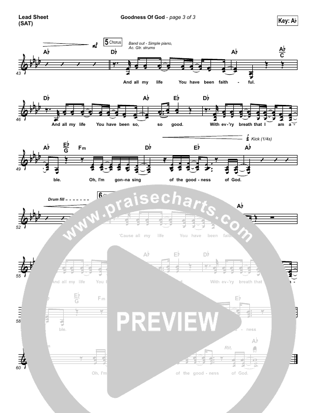Download the sheet music for Goodness Of God by Bethel Music / Jenn Johnson, from the album Victory. This song was arranged by Ed Kerr in the key of A, Ab, Bb, C, G.
