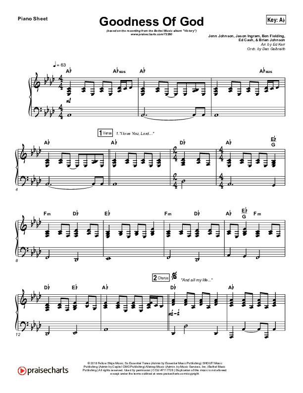 Download the piano sheet for Goodness Of God by Bethel Music / Jenn Johnson, from the album Victory. This song was arranged by Ed Kerr in the key of A, Ab, Bb, C, G.