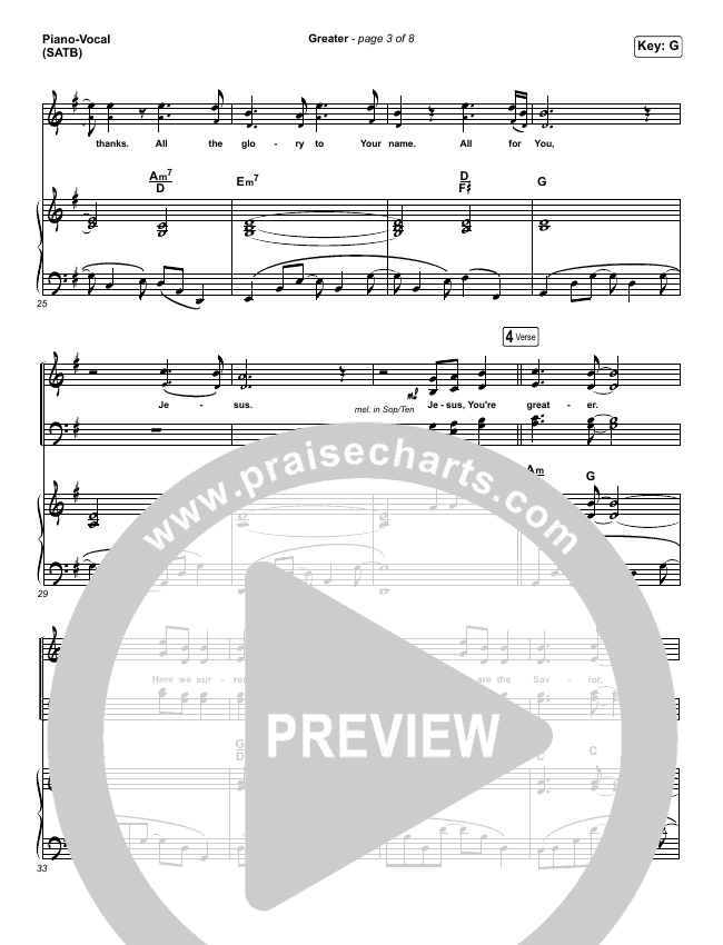 Download the sheet music for Greater by Highlands Worship, from the album Jesus You Alone. This song was arranged by Jeff Moore in the key of F, G.